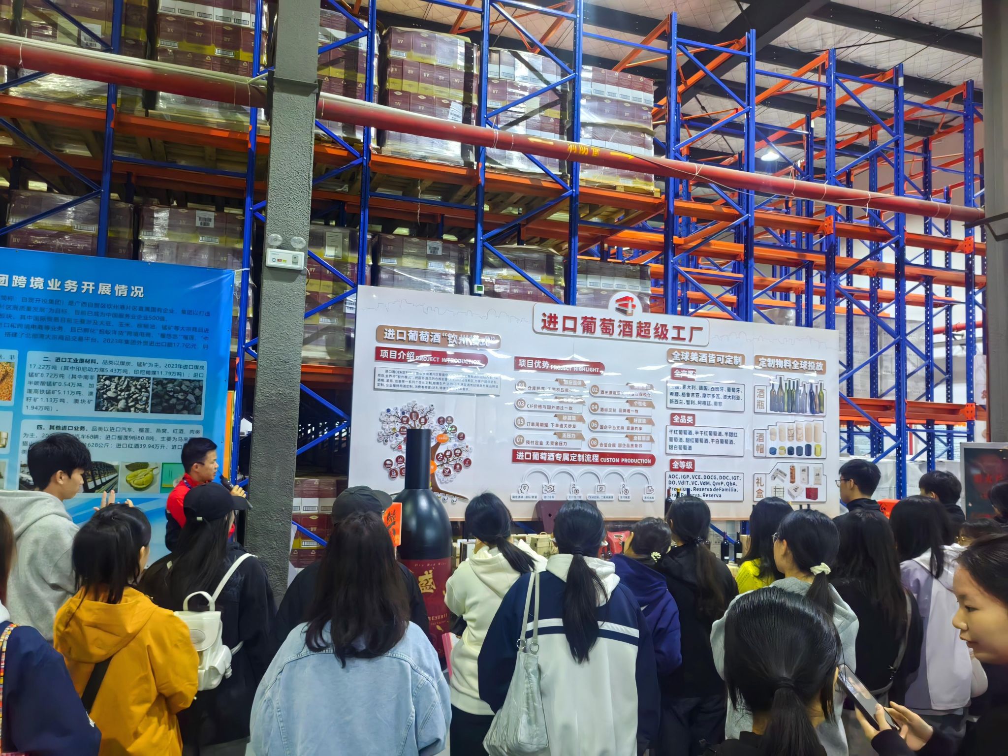 在自贸开投集团冷链保税交易中心,讲解员详细讲解来自东南亚的热带水果,通过智能温控系统保持新鲜,如何实现“保税仓储”、“快速通关”。在自贸开投集团钦盛酒库,酒库负责人带领师生参观智能仓储系统,通过电子标签可实时查询每瓶酒的产地、报关时间、存储温度等信息。学生们还体验了酒库的 “云品鉴” 平台,通过 VR 技术 “走进” 海外酒庄,在虚拟场景中了解酿酒工艺,感受 “数字贸易” 与传统酒类贸易的融合创新。在北部湾港钦州智慧码头的中央控制室,巨大的电子屏实时显示码头作业情况,无人集卡按照预设路线精准运输集装箱,桥吊、场桥通过 5G + 北斗定位系统实现自动装卸。