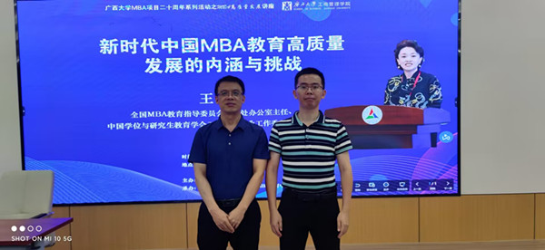 本次活动邀请了全国MBA教育指导委员会秘书处办公室主任、中国学位与研究生教育学会工商管理专业工作委员会秘书长王萍女士、广西区内其他4所MBA举办高校的负责人等参加。上午,王萍女士做了“新时代中国MBA教育高质量发展的内涵与挑战”的主题报告;下午,举行了“广西MBA教育如何实现高质量发展”的院长论坛,广西区内的5所MBA举办高校的负责人分享了各自经验。