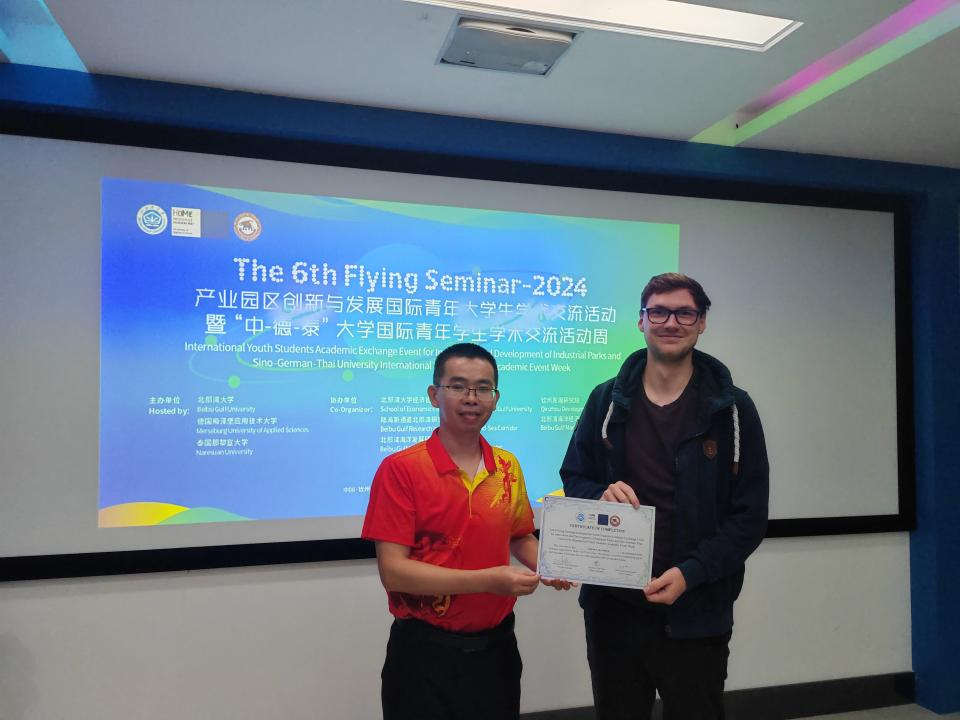 9月14日,2024产业园区创新与发展国际青年大学生学术交流活动暨“中-德-泰”大学国际青年学生学术交流活动圆满结束。本次活动为期一周,由北部湾大学、德国梅泽堡应用技术大学及泰国那黎宣大学联合主办,北部湾大学经济管理学院、陆海新通道北部湾研究院、北部湾海洋发展研究中心承办,共计60位三国高校师生参加此次活动。