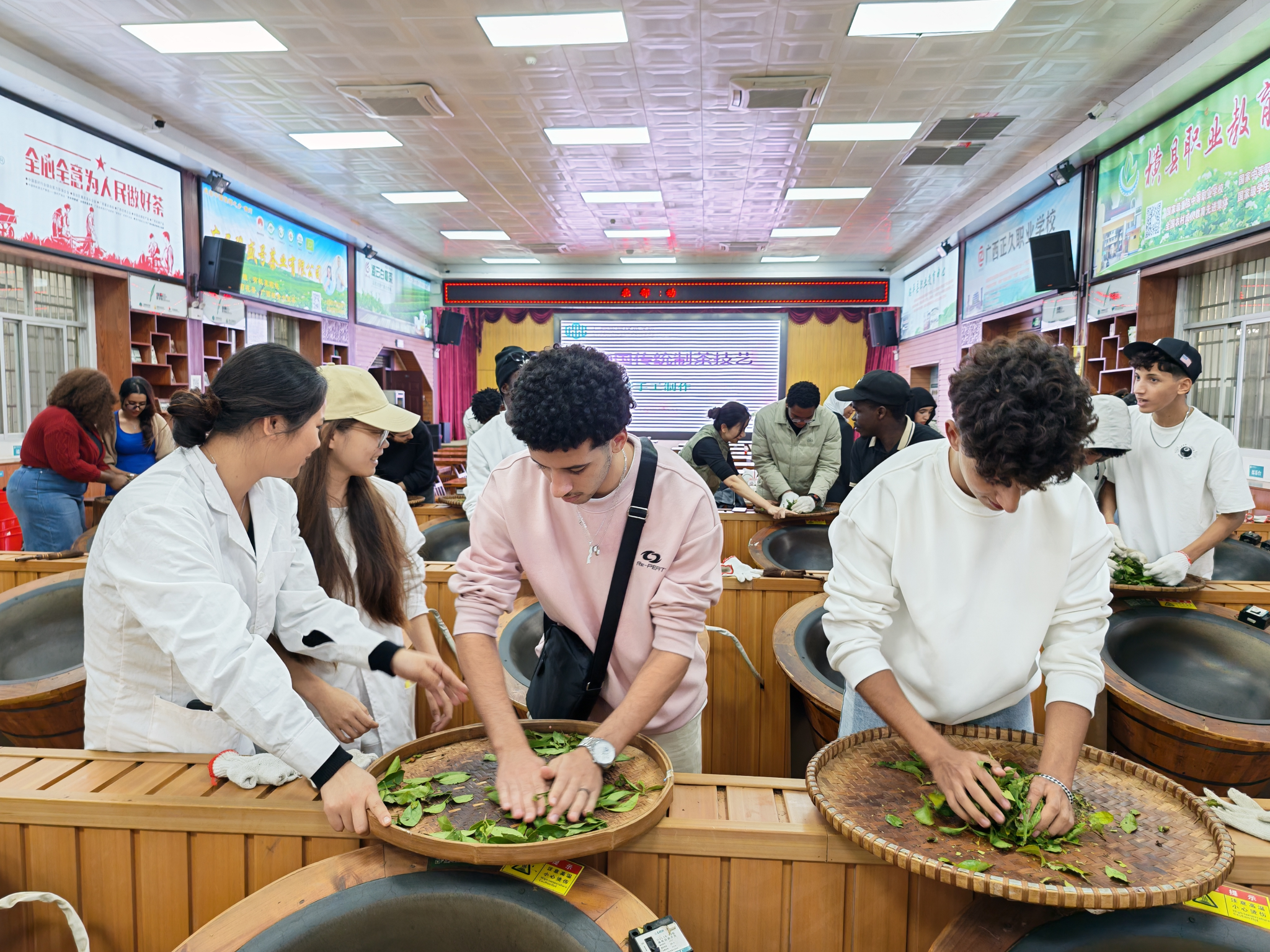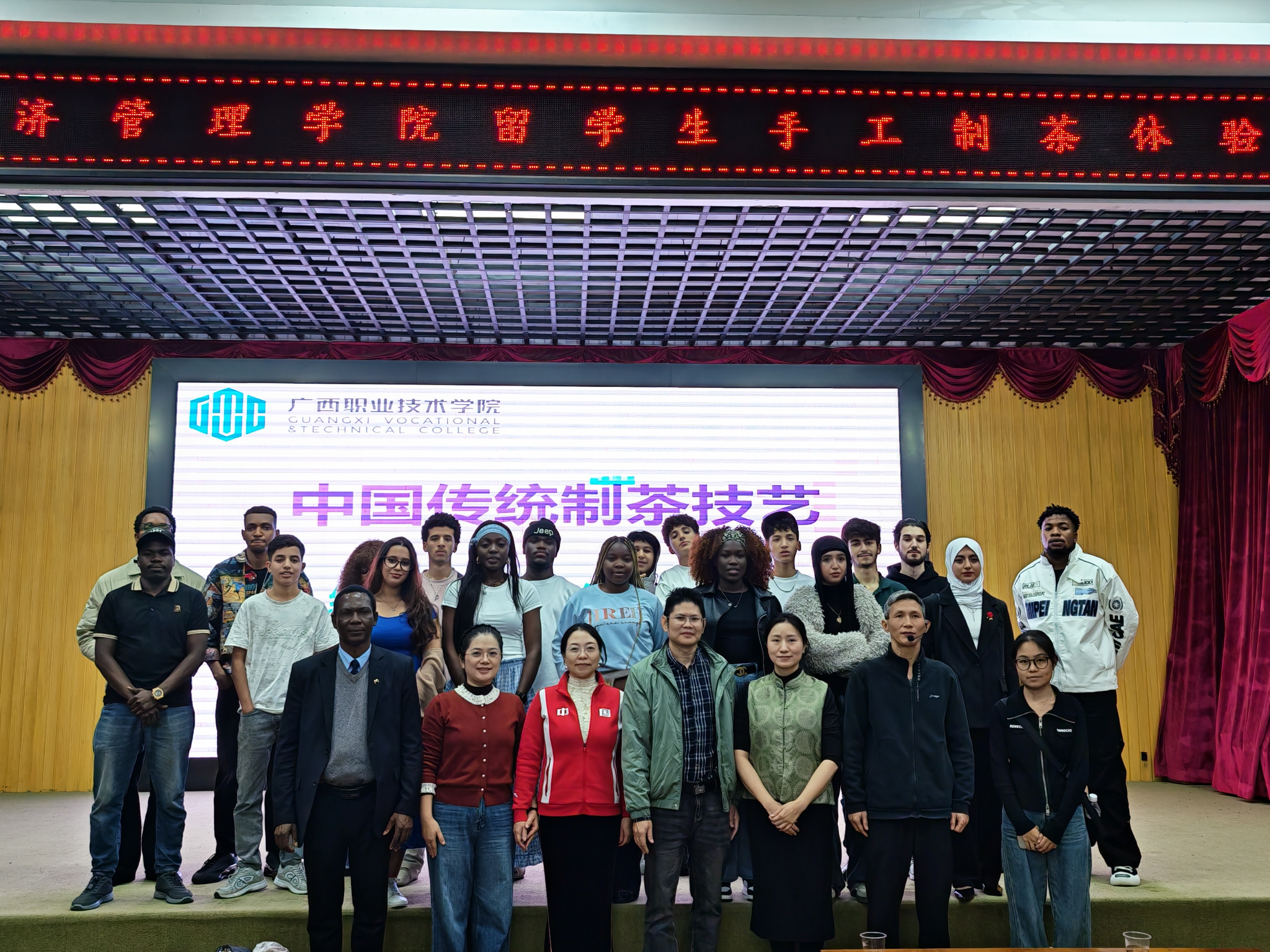实践的第二站是广西职业技术学院,聚焦于中国文化最具代表性的载体之一——茶。在现代制茶工程中心,学生们了解了茶叶从种植到加工的现代产业链;而在茶叶博物馆与茶文化体验中心,学习则进入了沉浸式体验阶段。一场由中国茶艺师演绎的传统茶艺表演,成为无声的文化教学。行云流水的动作、专注虔敬的神情,淋漓尽致地展现了茶道“和、敬、清、寂”的精神内核。随后的实践环节,留学生们亲自尝试温杯、投茶、冲泡、分汤。他们小心地感受水温,观察茶叶的舒展,在宁静的仪式感中体会东方哲学里的专注与平衡。