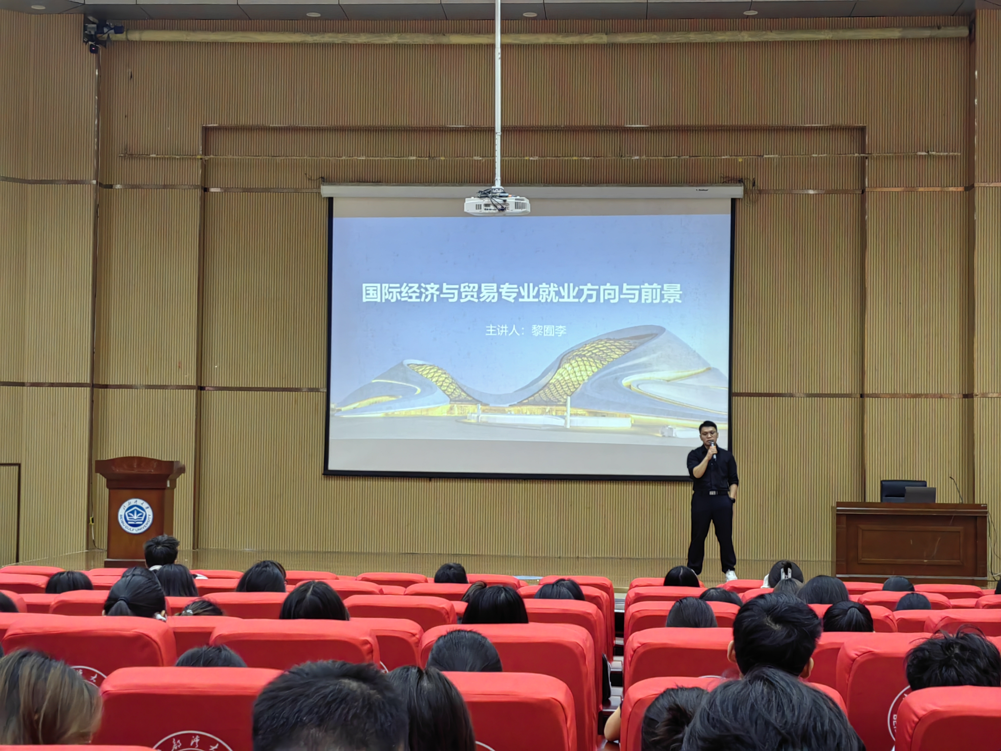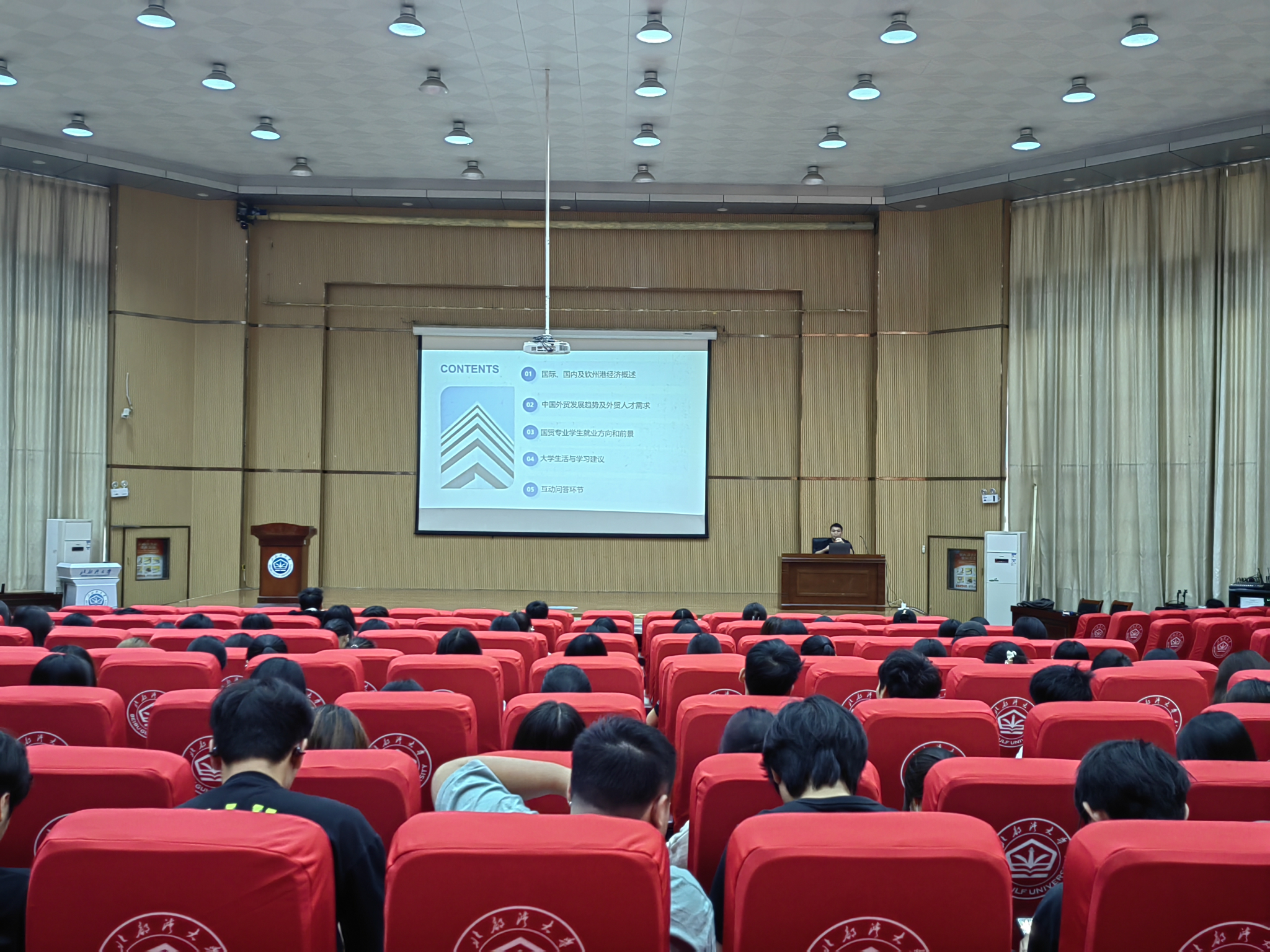 讲座围绕“国际经济与贸易专业就业方向与前景”这一主题展开。黎囿李经理首先从宏观视角出发,系统介绍了国际与国内经济形势,并结合钦州港作为西部陆海新通道重要枢纽的发展现状,分析了区域外贸的机遇与挑战。他通过详实的数据与案例,解读了当前外贸发展的新趋势、新业态,提升了同学们对行业环境的整体认知。