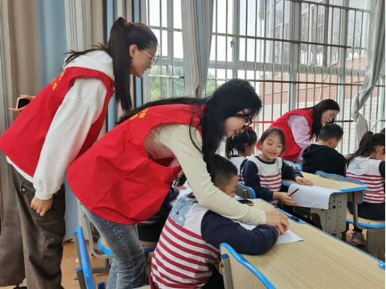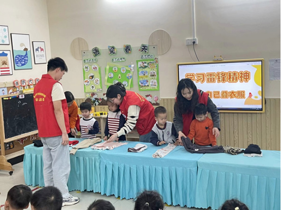 此外,党团成员们还亲手教孩子们学习了一些生活技能。他们耐心地教孩子们如何正确穿鞋、叠衣服、叠被子,让孩子们在实践中学会了这些基本的生活技能。同时,他们还指导孩子们画画,通过绘画的方式表达他们对雷锋精神的理解和感受。