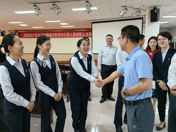 中国银行钦州分行和中国建设银行钦州分行的负责人分别结合当前金融行业的发展现状及前景,详细介绍了企业的用人需求和人才培养要求,高度认可我校的人才培养质量,希望每年有更多优秀的人才进入企业工作。