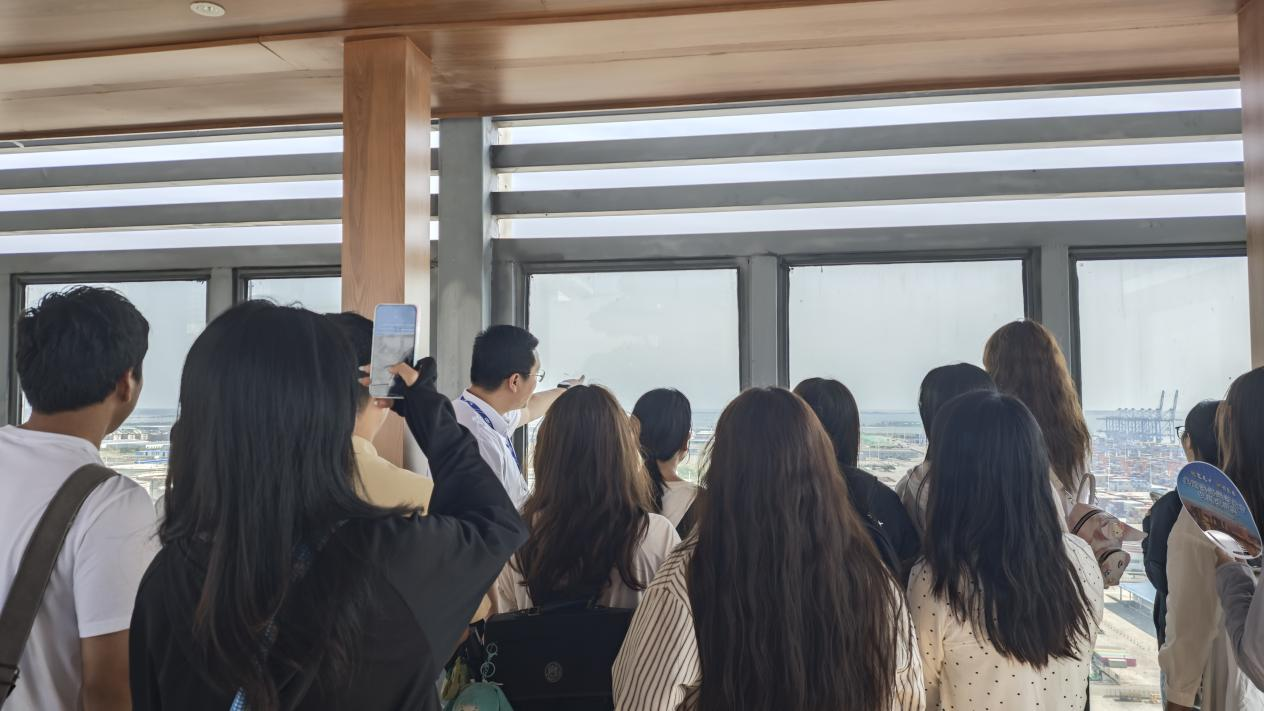 下午,同学们来到自贸开投集团大楼25楼港区观景台,俯瞰钦州港码头的繁忙景象,近距离感受现代化港口的雄伟壮观。随后,他们参观自贸开投集团钦盛酒库,学习了解进出口产业的仓储知识。