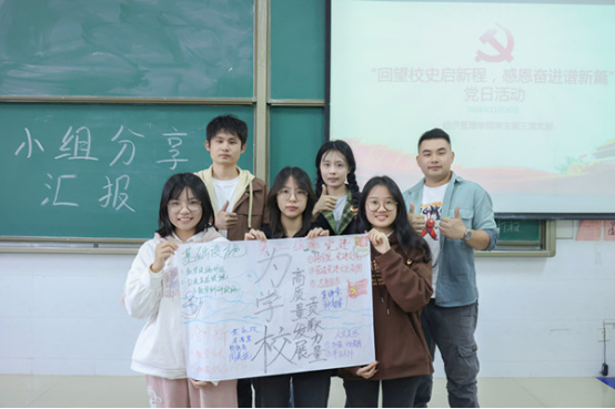 11月26日下午,经济管理学院学生第三党支部在校内举办了以“回望校史启新程,感恩奋进谱新篇”为主题的党日活动。活动旨在通过回顾学校的发展历程,激发党员们的爱国爱校情怀,并为学校的高质量发展贡献力量。支部全体党员及入党积极分子参与。