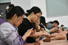 活动伊始,首先由经管学院学生第二党支部邵美琪同志带领参加活动党员参观陶设学院坭兴陶展厅,并做出专业讲解,感悟坭兴陶艺术的魅力。紧接着,由陶设学院学生第一党支部的同志为大家详细讲解拉坯和手捏的技巧要点,在专业的指导下,学员们开始了坭兴陶的拉坯和手捏创作,将匠人精神运用于实践。