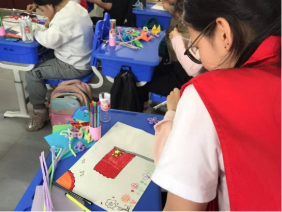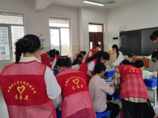 在钦南区特殊教育学校,65名志愿者充分发挥专业优势,为培智学生量身打造“红色育人”特色课程。志愿者们采用“一对一”结对帮扶模式,耐心细致地指导特殊儿童创作《红星照我心》主题绘画,手把手教他们制作党徽剪纸作品,以生动有趣的方式在孩子们心中播撒红色种子。志愿者们认真倾听特殊儿童的心声,并精心撰写祝福卡片,用温暖的话语传递党组织的深切关怀。这次活动不仅为特殊教育群体搭建起融入社会的桥梁,更让青年党员在服务实践中深刻领悟了“人民至上”理念的内涵。