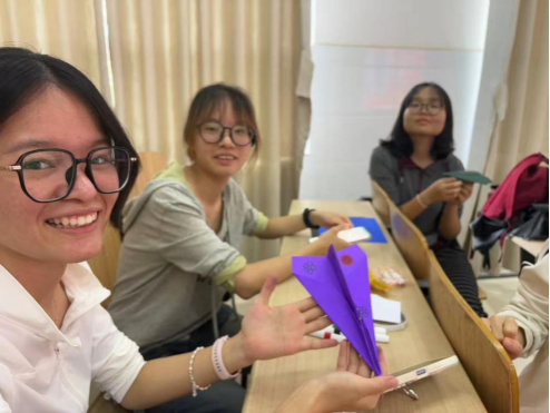 在纸飞机竞飞与初心阐释环节中,“初心跑道”的设置别具匠心。跑道起点线标识为“起点:1921”,地面按时间顺序贴有1921、1949、1978、2012、2035等关键年份标记,直观展现党的奋斗历程与未来目标。飞行前,小组代表在“初心跑道”起点进行1分钟“航迹解说”,包含“党史线索卡”关键词的核心精神、纸飞机设计体现的传承与发展以及“航迹名称”的寓意。