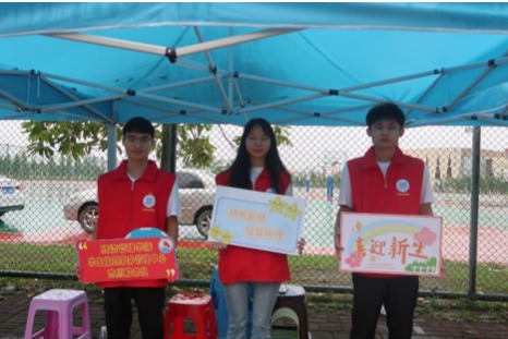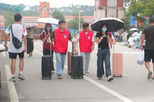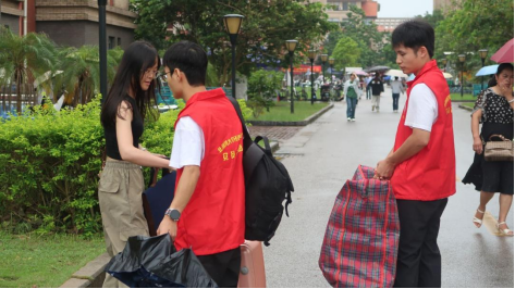 迎新现场,志愿者身着志愿者马甲,党员佩戴党员徽章,无惧风雨,始终保持热情主动的态度,积极帮助新生搬运行李、答疑解惑,为初次到校的新生和家长送去温暖和关心。